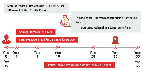 *LI Age 21, Male, Non Smoker, Option 1: Life Cover, PPT: Regular Pay, SA: ₹ 1 Cr., PT: 10 years, Premium paying term: 10 years, Annual Premium: ₹ 5900/- ( which is ₹ 491.66/month) Premium exclusive of GST. On death, 1 Cr SA is paid and the policy terminates.